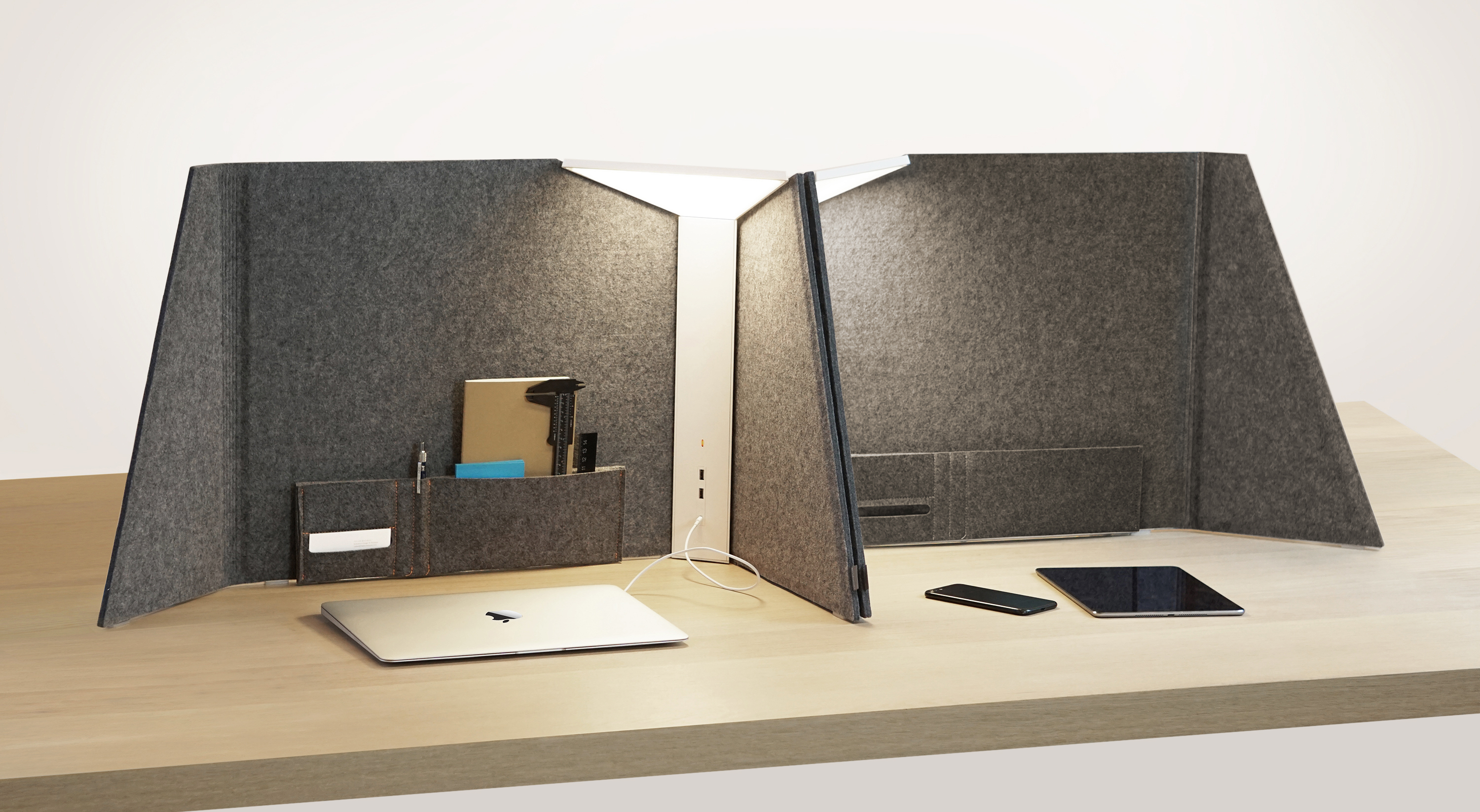 Today, everyplace is a workplace. Due to the constantly changing landscape of work, the new open workplace can be inconvenient, uninviting and distracting. Corner Office is designed to enhance the flexibility and efficiency of today’s open plan workplace by defining personal space in these dynamic environments. It contributes to motivation, efficiency and well-being; providing visual privacy, sound reduction, task lighting, and desktop power. Corner Office provides light, power and privacy in a flexible desktop unit that is perfect for shared desking groups as well as home office situations. It is an instant ergonomic upgrade to existing open tables and desks. A pop-up desktop office in a box requiring minimal installation time.