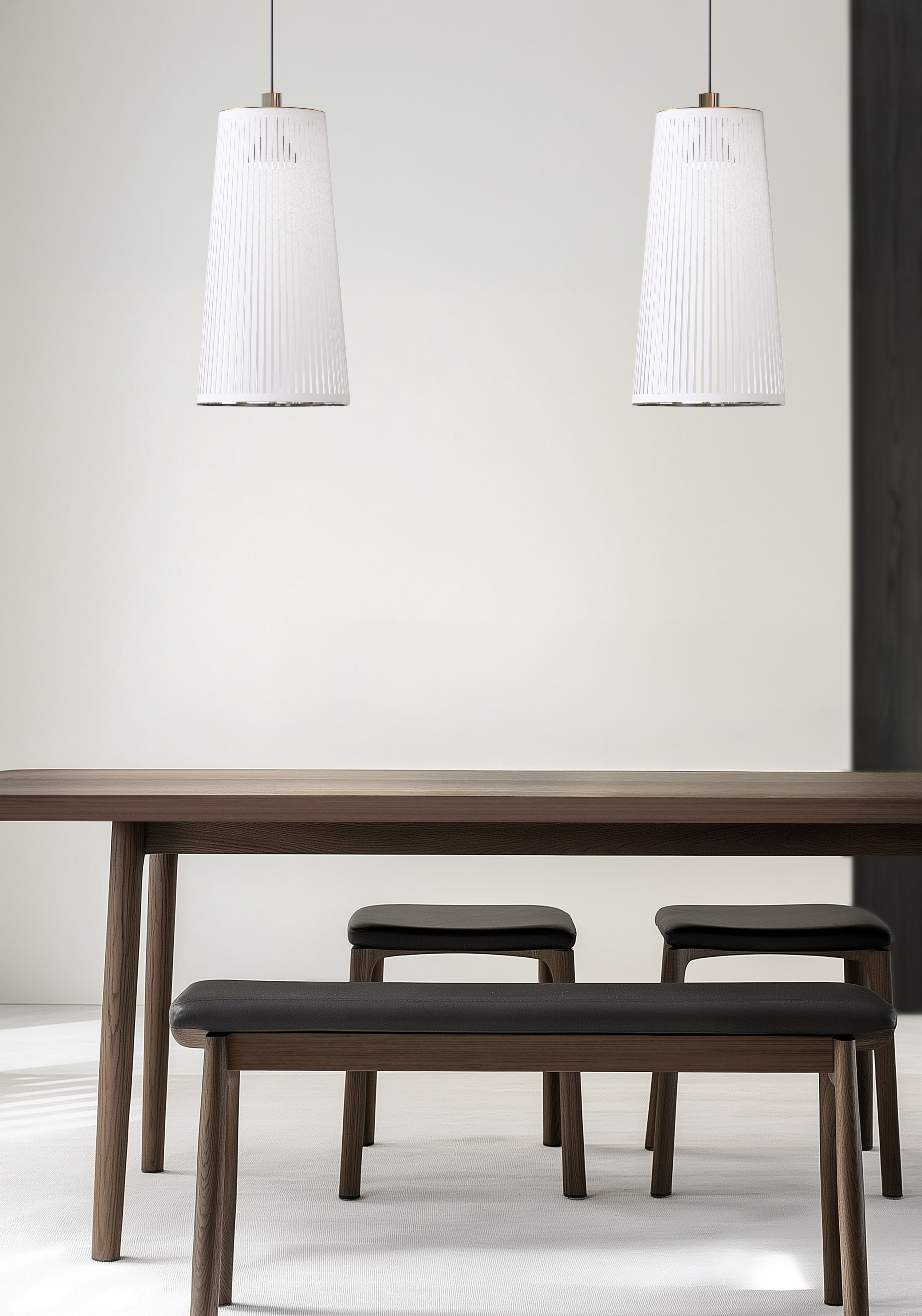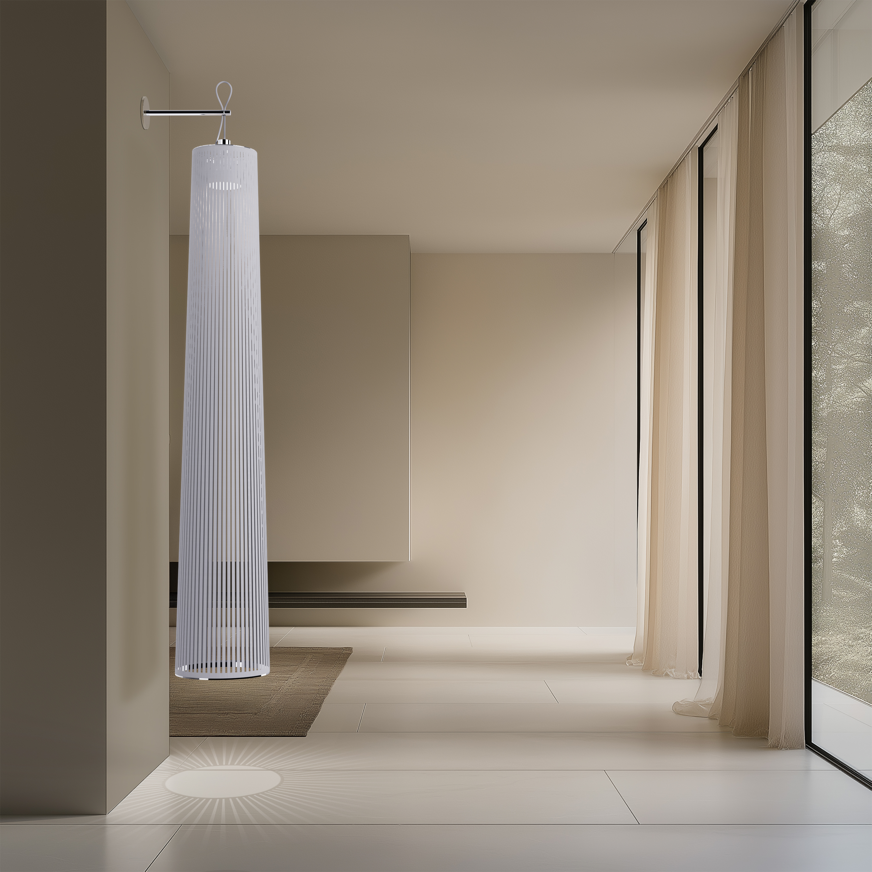 Light and ShadowAt the heart of Solis is a meticulously laser-cut polyester shade; its precise pattern filters light into elegant, sunburst-like rays, casting both direct and ambient glow that radiates warmth and quiet drama throughout the space.